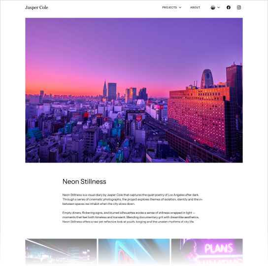 Choose from three immersive, photography-first designs: full-bleed, grid, or slideshow. Perfectly composed for every screen.
