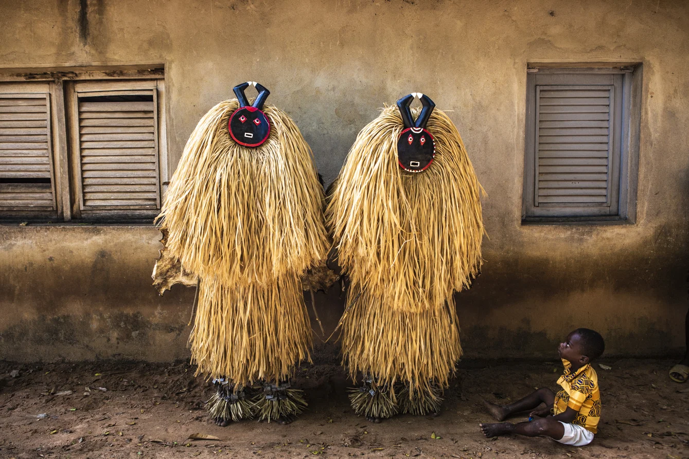 “The intriguing thing about this image is the way that the figures in the ceremonial dress and masks are juxtaposed with the young boy gazing up at them wearing a modern shirt in the same color palette. The light, the composition, and the framing of the figures between the windows direct the eye towards the main focal point and then the small boy acts as a counterpoint. It is a gentle but vivid contrast between traditionalism and modernity.” — Steve McCurry