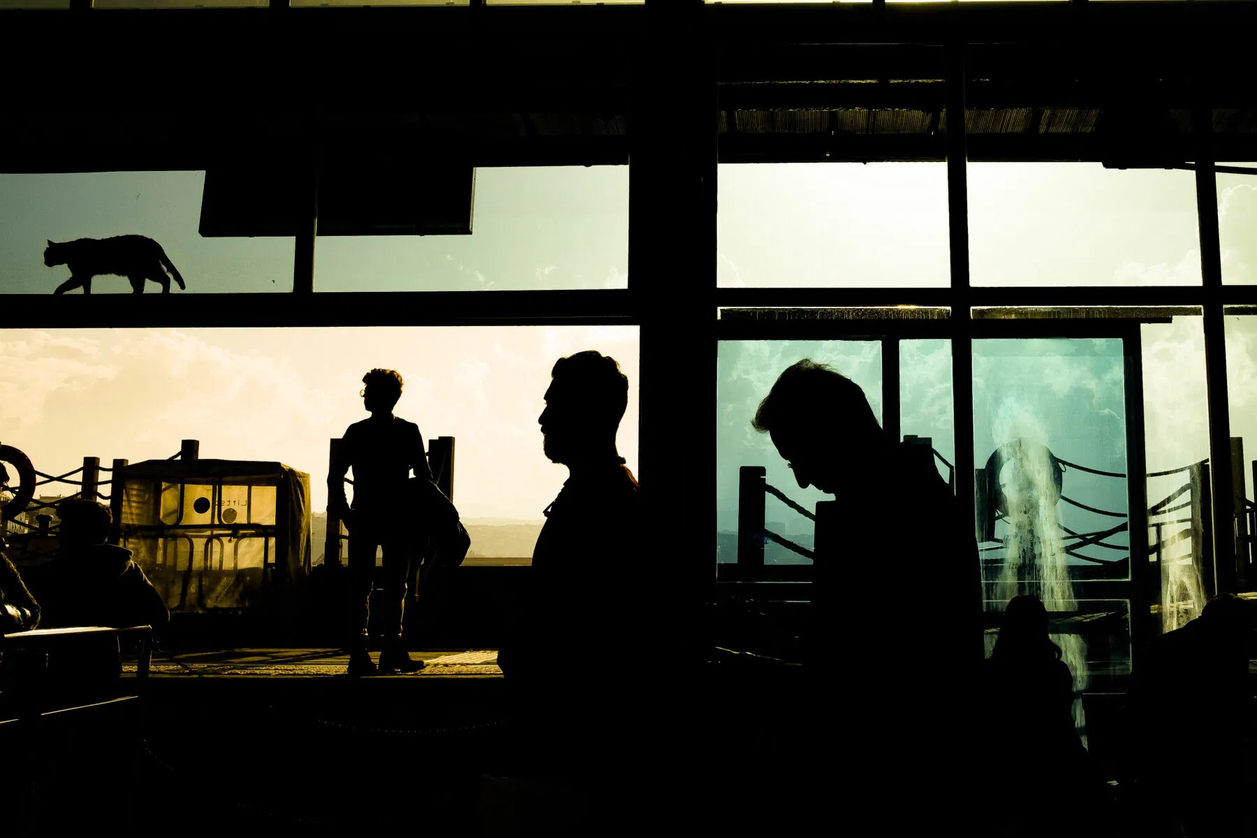 “A triumph of light and shadow, the photographer has elevated an ordinary moment into a captivating composition. Emerging from the elongated shadows cast by the late afternoon glow, the figures move quietly through their tasks, seemingly oblivious to the feline observer above. Surrounding them, a mosaic of shapes and textures—the crisp lines of the window frames, the variegated hues of the glass panels, and the intricate maritime details. Meanwhile, in the distance, the coastal landscapes blend softly into the golden sky, adding a final stroke to an evocative scene.” – The Independent Photographer Editors